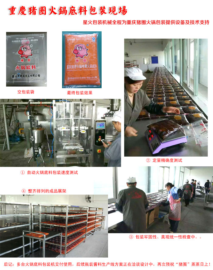 重慶豬圈火鍋是重慶豬圈飲食文化有限公司創(chuàng)立的火鍋連鎖品牌,公司成立于2003年,公司集火鍋底料開發(fā)、研制、外加工等綜合性實體公司。本公司旗下有“豬圈火鍋”(重慶老火鍋)、“天鍋香火鍋”(重慶新派火鍋)、“御豬豬圈火鍋”三大品牌,均獲得國家商標注冊,公司3家直營店均分布在重慶主城區(qū),分布在全國各地的加盟店100余家,自建食品廠一個,占地13000平方米,總投資3500萬,通過國家QS認證。公司火鍋底料生產部為了滿足生產需求,再全國招募火鍋底料包裝機械生產企業(yè),經過層層篩選,最終和我公司達成戰(zhàn)略合作伙伴關系,由我公司負責該公司火鍋底料、醬料系列產品灌裝全套設備。